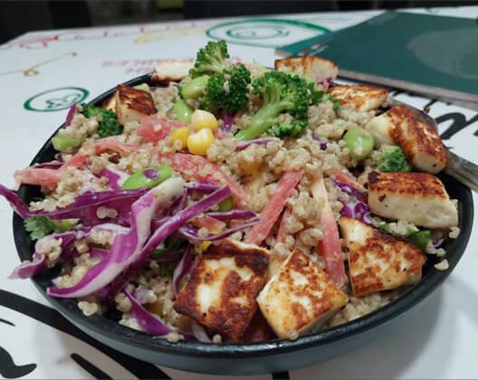 Savor the Goodness: At Wake Up Bowl, we take pride in offering healthy salads crafted from fresh vegetables, fruits, beans, dairy products, seeds, dry fruits, grains, and olive oil. Our salads are not just meals; they are a perfect blend of convenience and health, providing you with the essential nutrients your body needs. Each meal is a balanced source of protein, carbohydrates, fats, fiber, vitamins, minerals, and water – the seven powerful elements for energy and vitality.